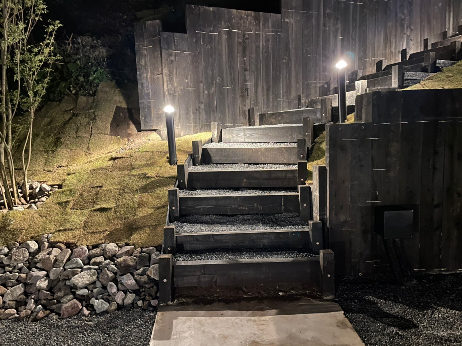 階段は枕木を使用 ビンテージな雰囲気で建物からのアクセスも楽にできるよう仕上げています。